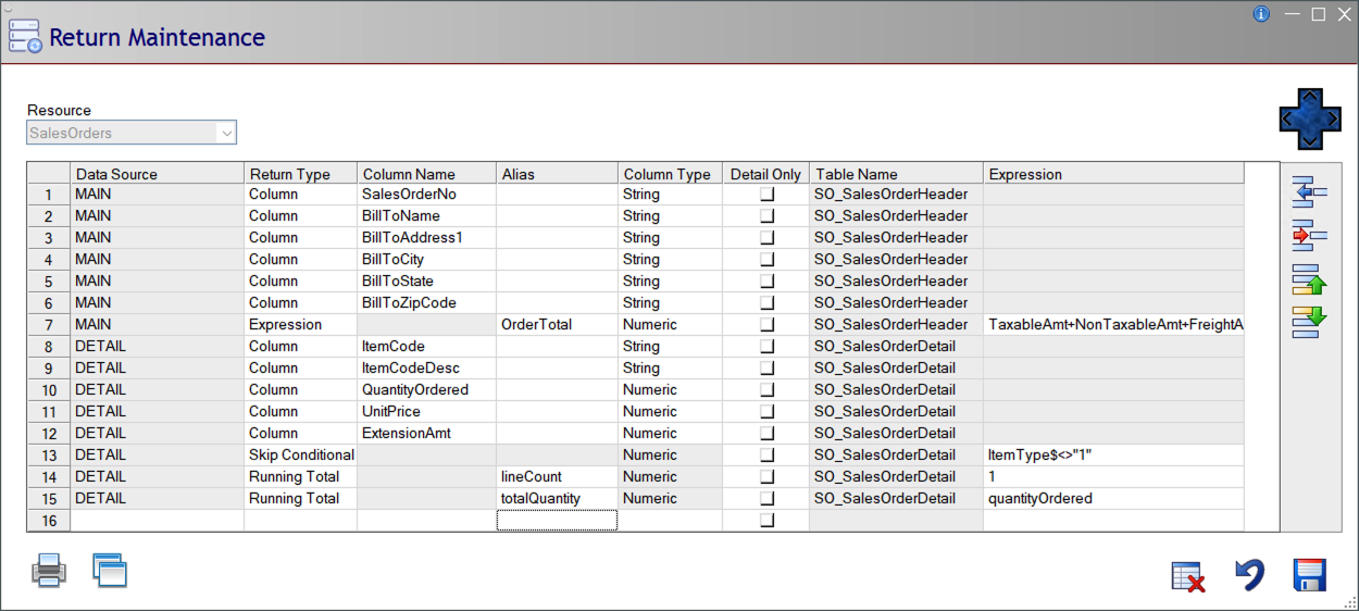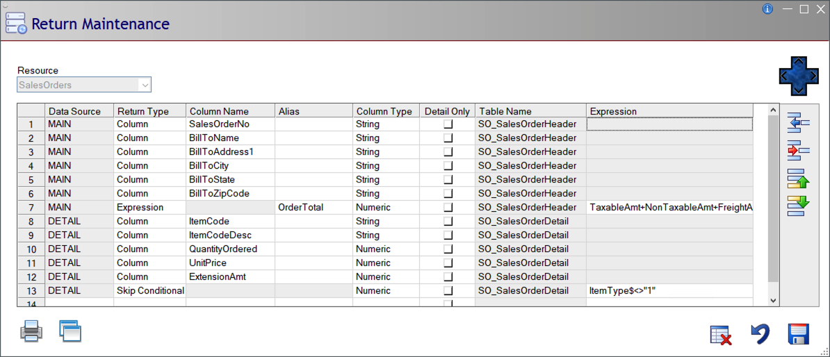 The image above shows a Skip Conditional entry for the Sales Order DETAIL Data Source. Note that the Column Name and Alias cells are locked. Column Type should be set to Numeric.